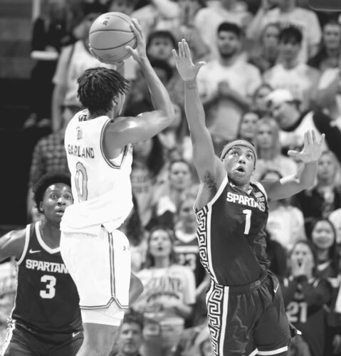 San Jose State guard Colby Garland, center, shoots as Michigan State guard Jeremy Fears Jr., right, defends on Thursday in East Lansing. (AP photo)