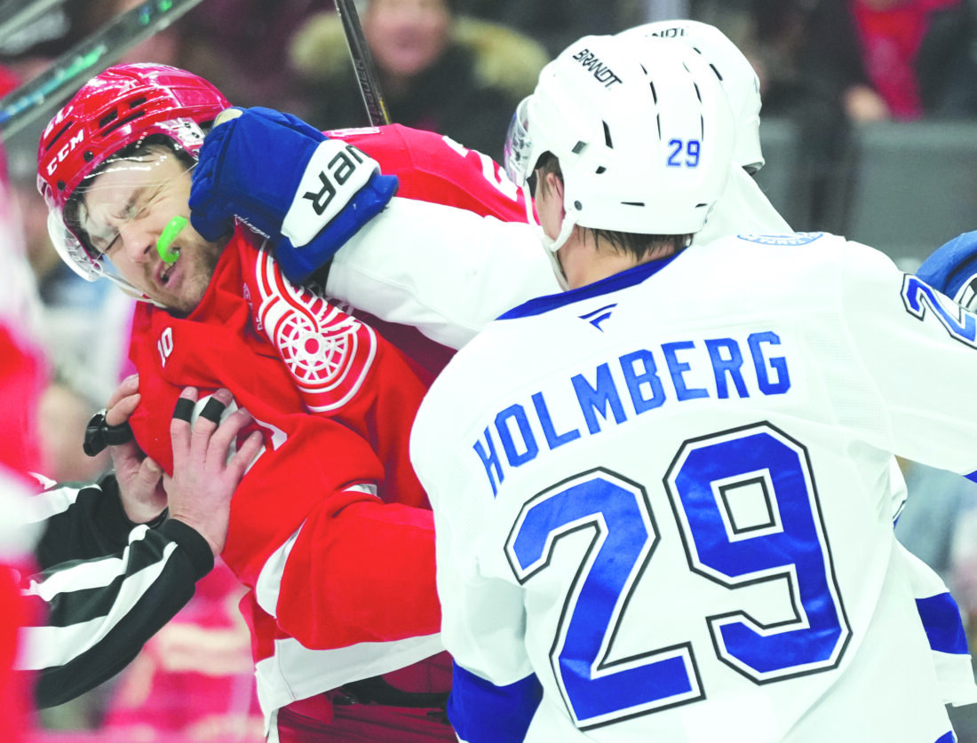 Red Wings left wing James van Riemsdyk, left, fights with Tampa Bay Lightning right wing Pontus Holmberg, front, and defenseman Emil Lilleberg, partially hidden, during the third period Friday in Detroit. (AP photo)