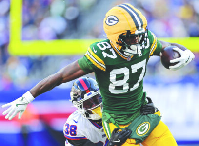 Green Bay Packers wide receiver Romeo Doubs, top, is tackled by New York Giants cornerback Korie Black on Sunday in East Rutherford, N.J. (AP photo)
