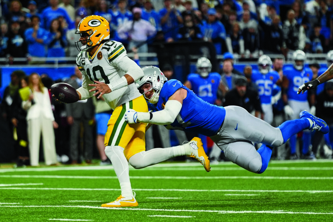 Green Bay Packers quarterback Jordan Love (10) is tackled by Detroit Lions defensive tackle Aidan Hutchinson (97) during the first half an NFL football game in Detroit on Thursday. (AP photo)
