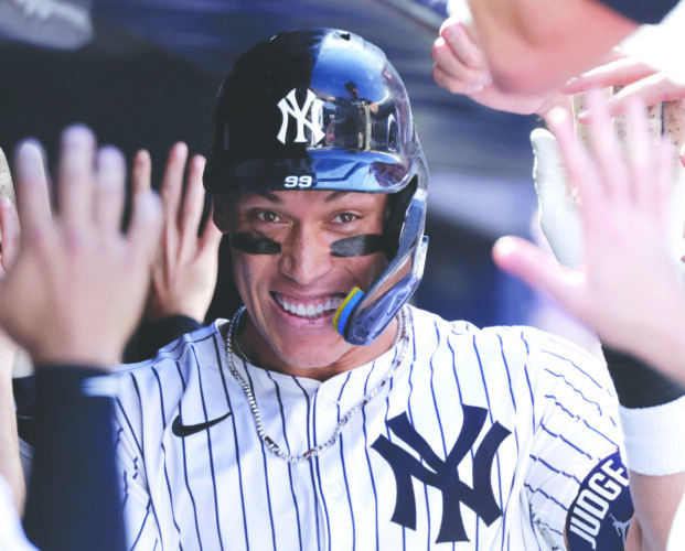 The Yankees' Aaron Judge is congratulated after hitting a two-run homer against the Athletics on June 29 in New York. (AP file photo)