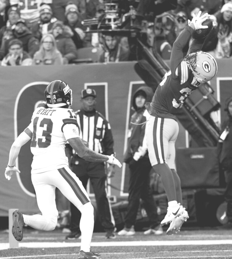 The Green Bay Packers' Evan Williams, right, intercepts a pass in front of the New York Giants' Jalin Hyatt during the second half Sunday in East Rutherford, N.J. (AP photo)