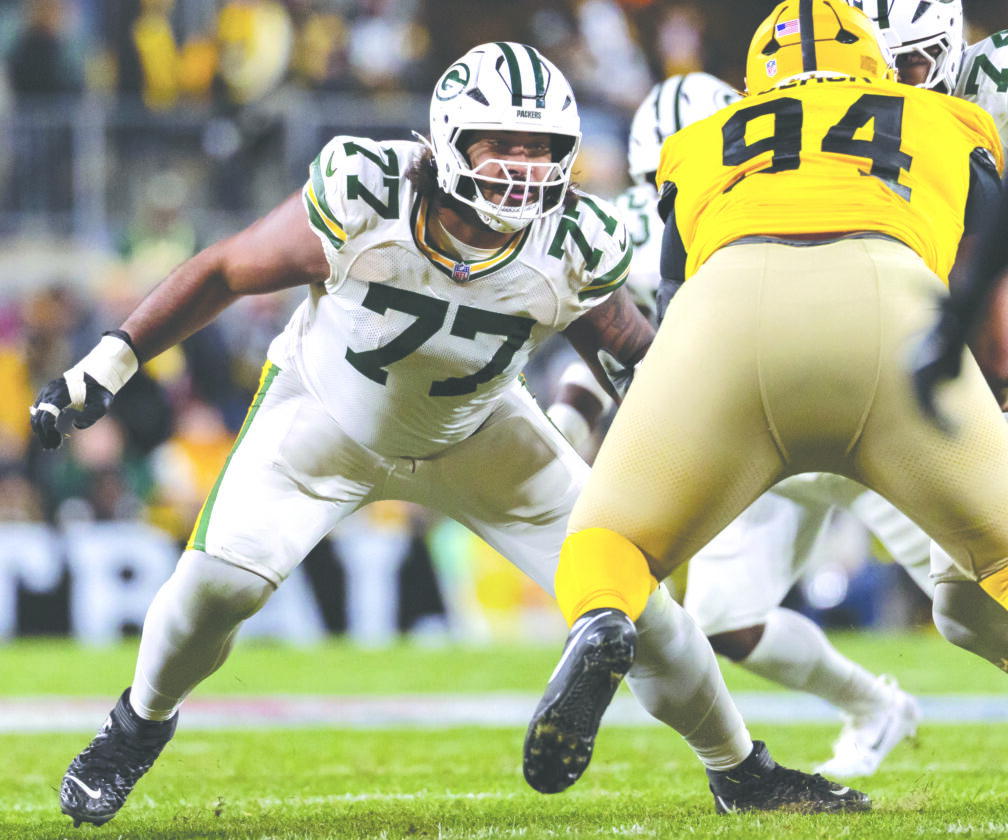 Green Bay Packers offensive tackle Jordan Morgan, left, blocks against the Steelers on Sunday in Pittsburgh. (AP photo)