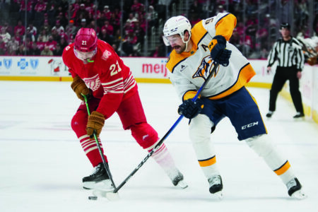 Detroit Red Wings left wing James van Riemsdyk (21) takes the puck from Nashville Predators left wing Filip Forsberg (9) in the first period of an NHL hockey game on Wednesday in Detroit. (AP photo)