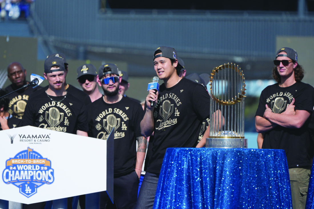 Los Angeles Dodgers' Shohei Ohtani speaks during a celebration of the baseball team's World Series win at Dodger Stadium on Monday in Los Angeles. (AP photo)
