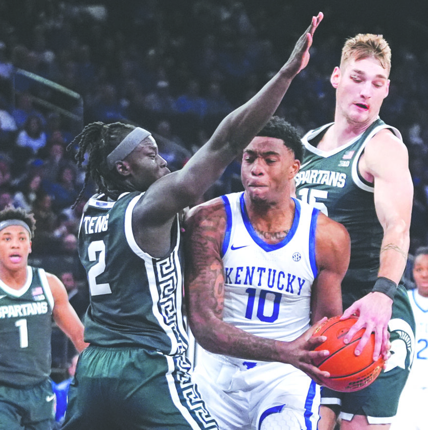 Michigan State's Kur Teng, front left, and Carson Cooper, right, defend Kentucky's Brandon Garrison during the first half on Tuesday in New York. (AP photo)