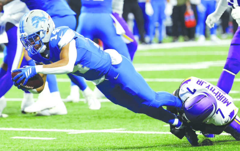 Lions wide receiver Amon-Ra St. Brown, left, is tackled by Minnesota Vikings cornerback Byron Murphy Jr. in Detroit on Sunday. (AP photo)