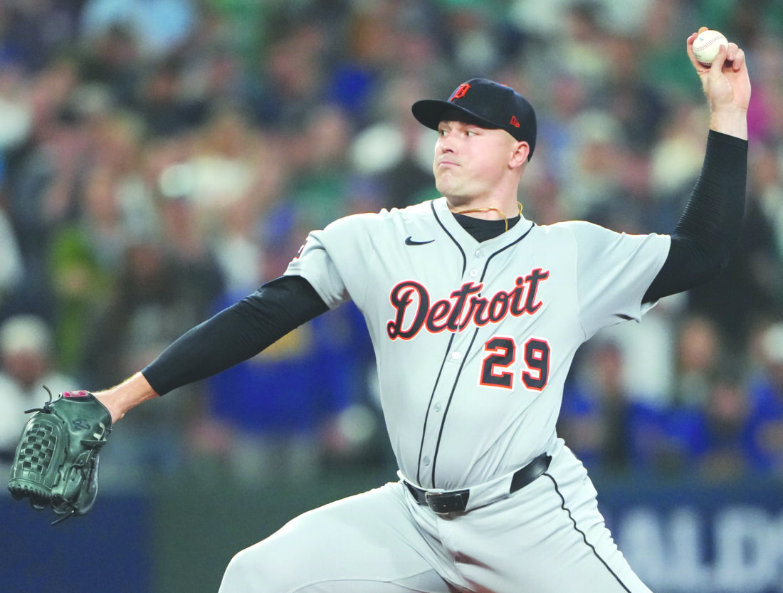 Detroit Tigers pitcher Tarik Skubal throws during the first inning in Game 5 of the American League Division Series against the Mariners on Oct. 10 in Seattle. (AP file photo)