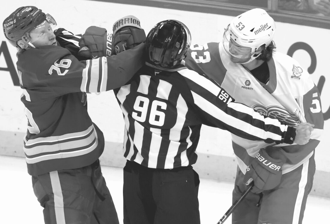 NHL linesman David Brisebois, center, separates Sabres defenseman Rasmus Dahlin, left, and Detroit Red Wings defenseman Moritz Seider during the third period on Oct. 22 in Buffalo, N.Y. (AP file photo)
