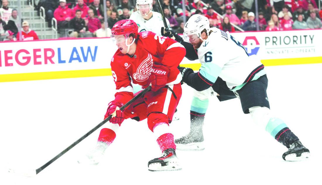 Red Wings center Nate Danielson, left, skates against Seattle Kraken defenseman Adam Larsson during the second period on Tuesday in Detroit. (AP photo)