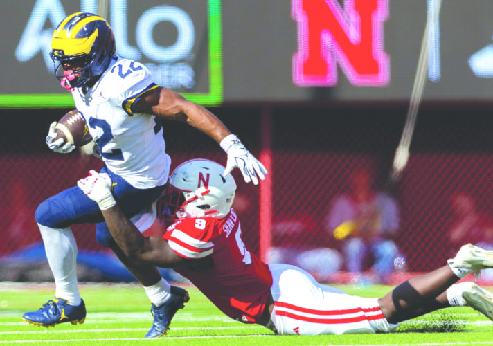 Michigan running back Justice Haynes, left, rushes against Nebraska linebacker Vincent Shavers Jr. on Sept. 20 in Lincoln, Neb. (AP file photo)