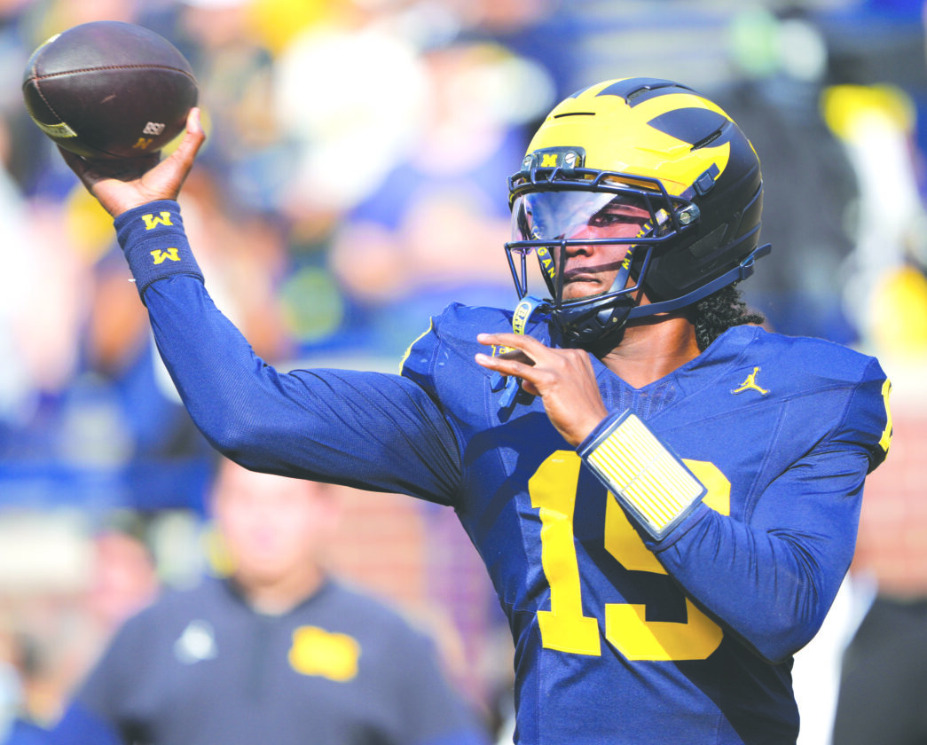 Michigan quarterback Bryce Underwood warms up before a game against Washington on Oct. 18 in Ann Arbor. (AP file photo)