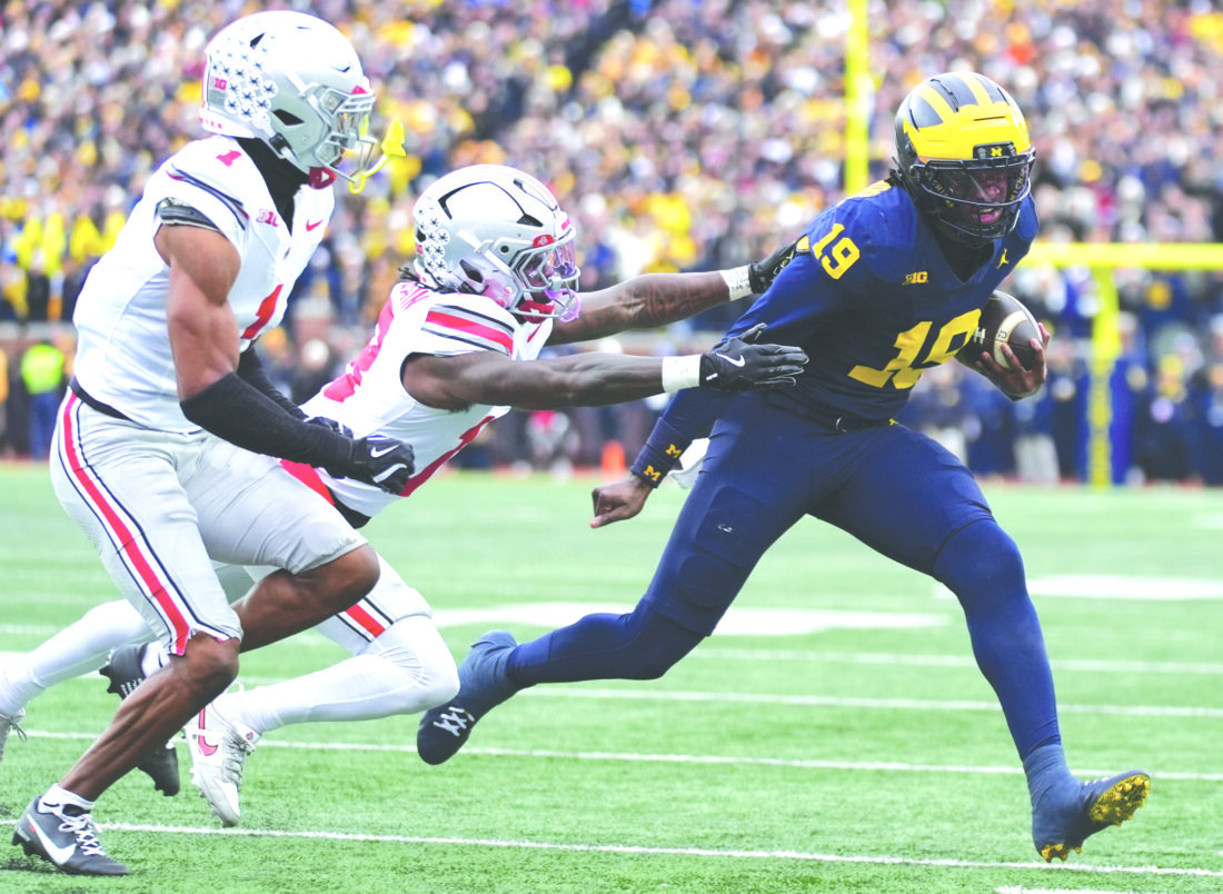 Michigan quarterback Bryce Underwood, right, is pushed out of bounds by Ohio State Buckeyes safety Jaylen McClain, center, and cornerback Davison Igbinosun during the first half on Saturday in Ann Arbor. (AP photo)