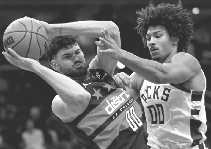 Wizards forward Tristan Vukcevic, left, pulls down a rebound against Milwaukee Bucks center Jericho Sims during the second half on Monday in Washington. (AP photo)