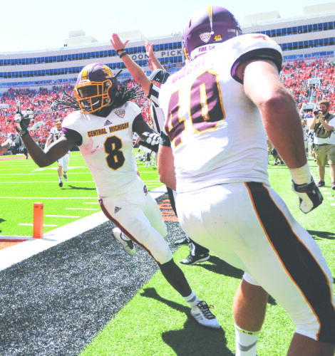 A referee, partially hidden at center, signals a touchdown as Central Michigan wide receiver Corey Willis, left, celebrates with teammate Joe Bacci after scoring the winning touchdown in the final seconds against Oklahoma State in Stillwater, Okla., on Sept. 10, 2016. (AP file photo)