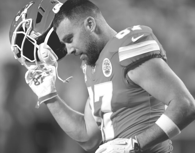 Chiefs tight end Travis Kelce takes off his helmet during warmups before a game against the Denver Broncos on Thursday in Kansas City, Mo. (AP photo)