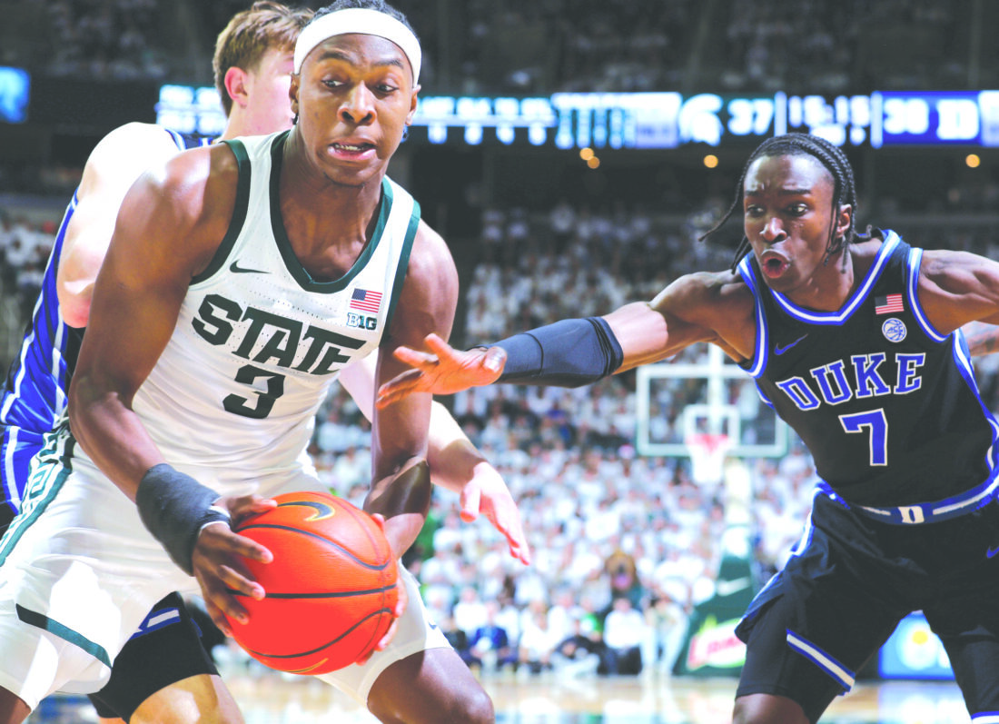 Michigan State forward Cam Ward, left, maneuvers for a shot against Duke guard Dame Sarr on Saturday in East Lansing. (AP photo)