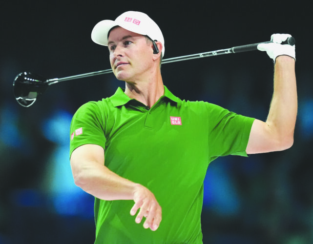 Adam Scott of Boston Common Golf watches his shot on the eighth hole during a match of the TMRW Golf League against Jupiter Links Golf Club on Jan. 27 in Palm Beach Gardens, Fla. (AP file photo)