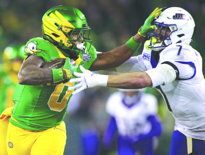Oregon running back Jordon Davison, left, stiff arms James Madison defensive back Jacob Thomas during the first half of a College Football Playoff game on Saturday in Eugene, Ore. (AP photo)