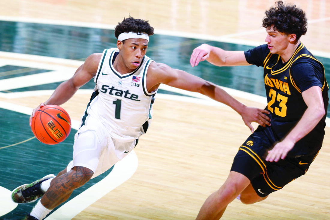 Michigan State guard Jeremy Fears Jr. (1), left, drives against Iowa guard Isaia Howard (23) during the first half of an NCAA college basketball game on Tuesday in East Lansing. (AP photo)