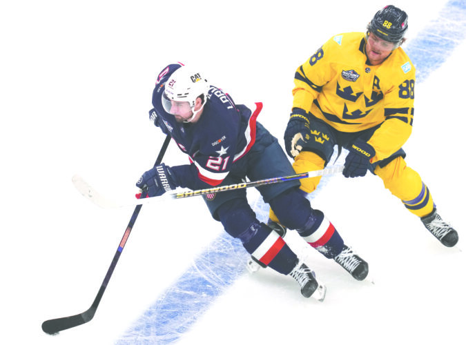 American and Detroit Red Wing Dylan Larkin, left, controls the puck against Sweden's William Nylander during the first period of a 4 Nations Face-Off game on Feb. 17 in Boston. (AP file photo)