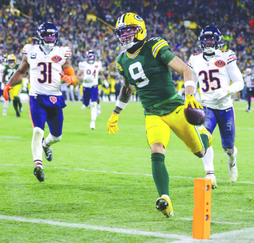 Packers wide receiver Christian Watson, center, runs into the end zone for a touchdown against the Chicago Bears on Dec. 7 in Green Bay, Wis. (AP photo)