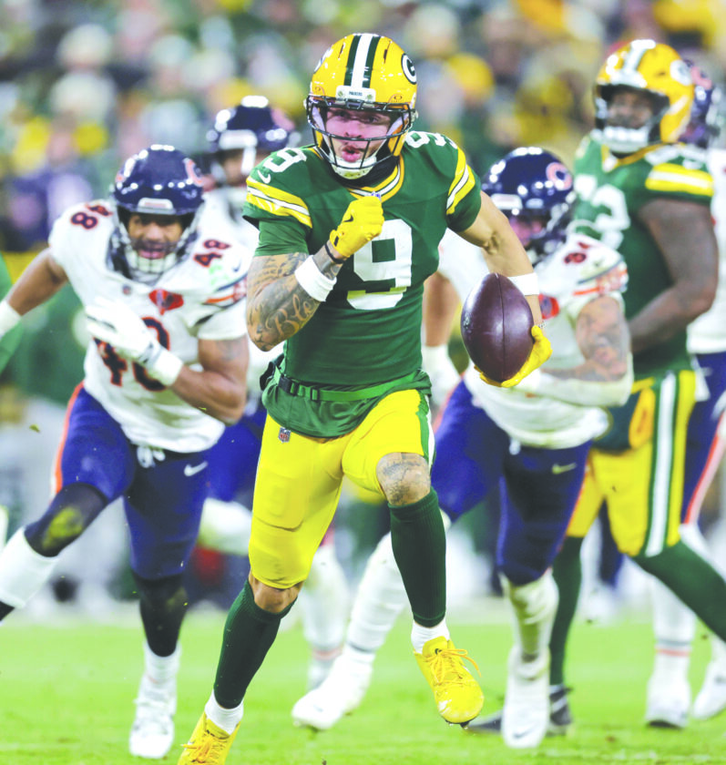 Packers wide receiver Christian Watson, center front, runs to the end zone against the Chicago Bears on Sunday in Green Bay, Wis. (AP photo)
