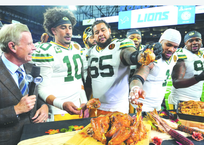 Green Bay Packers quarterback Jordan Love, second from left, guard Aaron Banks, center, defensive lineman Micah Parsons, second from right, and defensive lineman Warren Brinson, right, eat turkey following their win at the Lions in Detroit on Nov. 27. (AP photo)