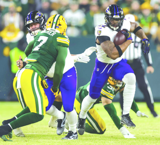 Baltimore Ravens running back Derrick Henry, right, rushes against the Packers' Quay Walker on Saturday in Green Bay, Wis. (AP photo)