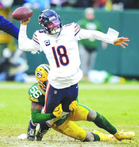 Chicago Bears quarterback Caleb Williams is sacked by Packers linebacker Edgerrin Cooper on Jan. 5 in Green Bay, Wis. (AP file photo)