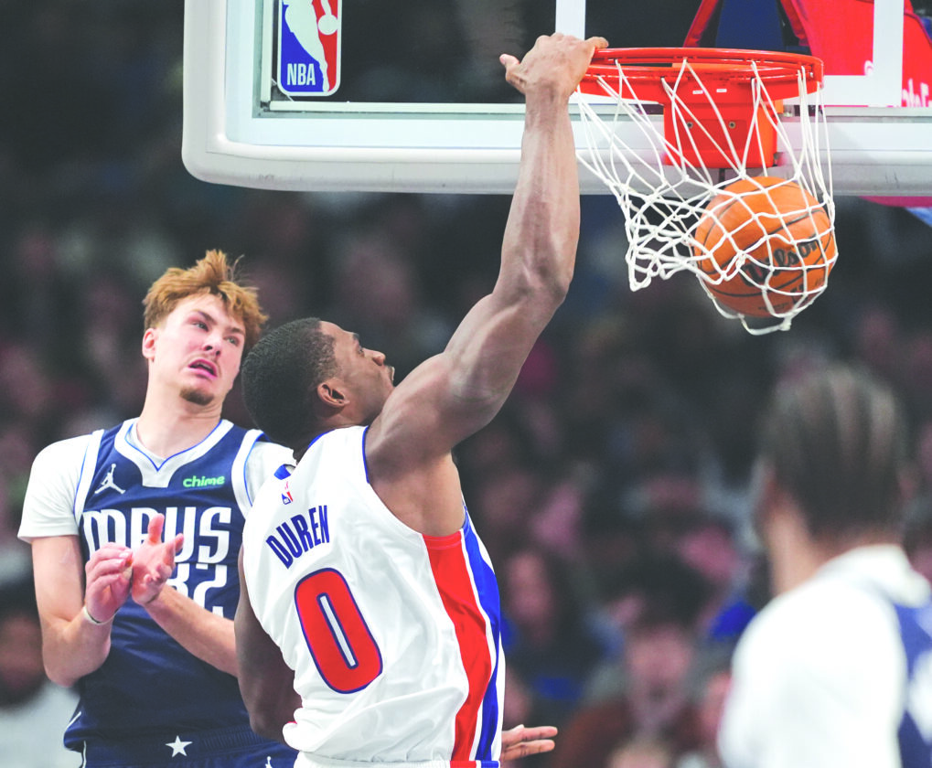 Detroit Pistons center Jalen Duren, center, dunks as the Mavericks' Cooper Flagg defends in the first half in Dallas on Thursday. (AP photo)