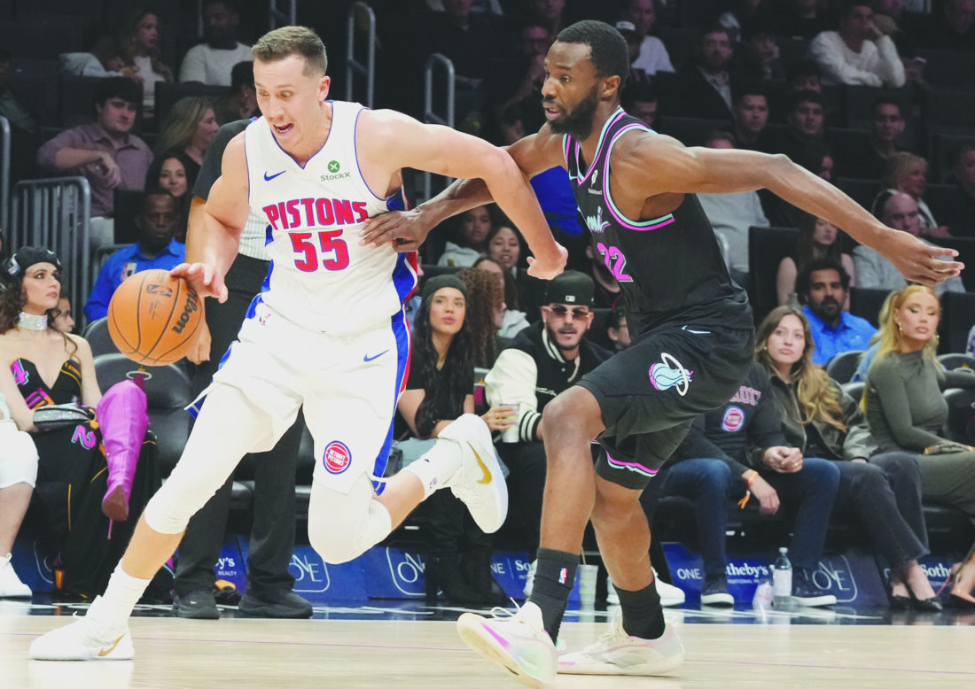 Detroit Pistons forward Duncan Robinson, left, dribbles the ball as Heat forward Andrew Wiggins defends during the first half on Saturday in Miami. (AP photo)