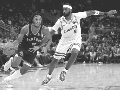 The Toronto Raptors' Immanuel Quickley, left, drives to the basket against the Bucks' Bobby Portis on Dec. 18 in Milwaukee. (AP file photo)