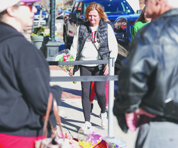 A supporter brings flowers to lay at a tribute at the NC Auto Racing Walk of Fame for Greg Biffle, on Friday in Mooresville, N.C. (AP photo)