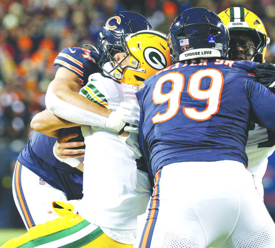 Green Bay Packers quarterback Jordan Love, second from left, is hit by Bears defensive end Austin Booker, left, during the first half on Saturday in Chicago. (AP photo)