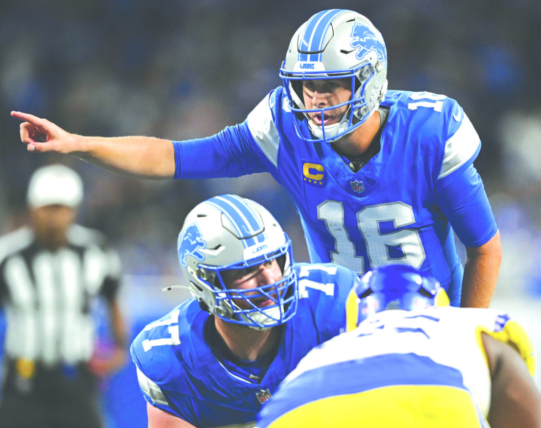 Lions quarterback Jared Goff, top, examines the defense during overtime of a game against the Los Angeles Rams on Sept. 8, 2024, in Detroit. The Lions won 26-20. (AP file photo)