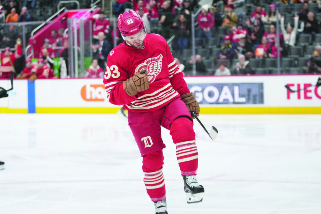 Detroit Red Wings right wing Alex Debrincat (93) celebrates his goal against the Boston Bruins in the second period of an NHL hockey game on Tuesday in Detroit. (AP photo)