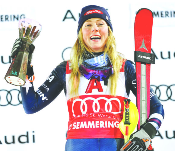 American Mikaela Shiffrin, winner of an alpine ski women's World Cup slalom, poses with the trophy in Semmering, Austria, on Sunday. (AP photo)