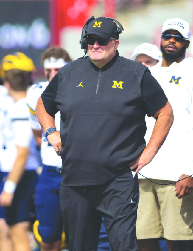 Michigan acting head coach Biff Poggi watches as his team plays against Nebraska on Sept. 20 in Lincoln, Neb. (AP file photo)