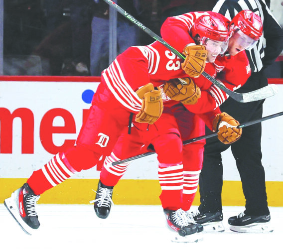 Red Wings defenseman Moritz Seider, left, is hugged by center Andrew Copp after Seider scored in overtime to defeat the Washington Capitals on Sunday in Detroit. (AP photo)
