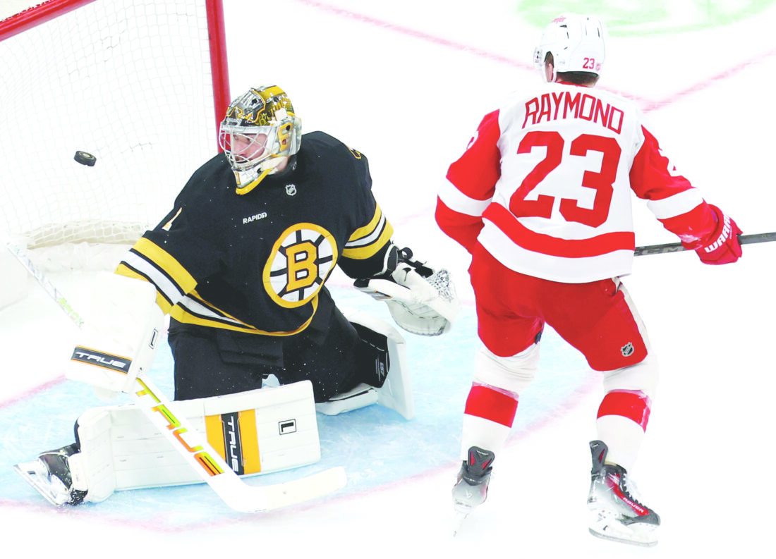 Detroit Red Wings forward Lucas Raymond, right, scores against Bruins goaltender Jeremy Swayman during the third period Saturday in Boston. (AP photo)