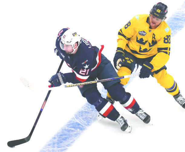 American and Detroit Red Wing Dylan Larkin, left, controls the puck against Sweden's William Nylander during the first period of a 4 Nations Face-Off game on Feb. 17 in Boston. (AP file photo)