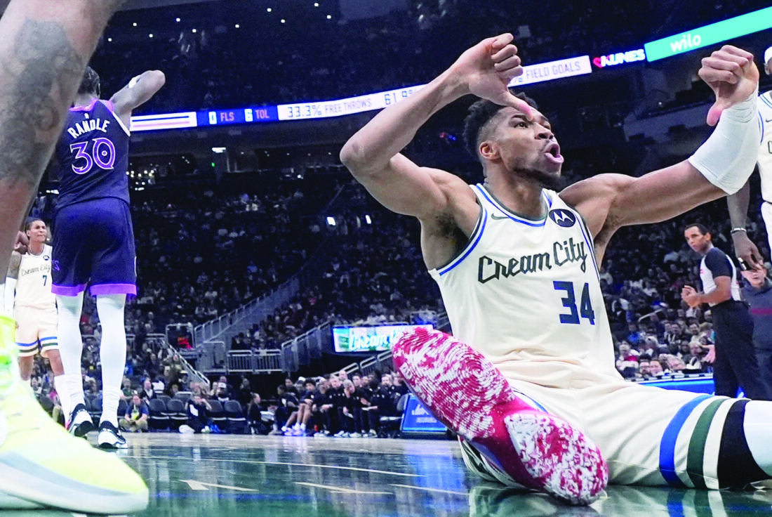 Milwaukee Bucks' Giannis Antetokounmpo reacts after being fouled during the second half of an NBA basketball game against the Minnesota Timberwolves on Tuesday in Milwaukee. (AP photo)