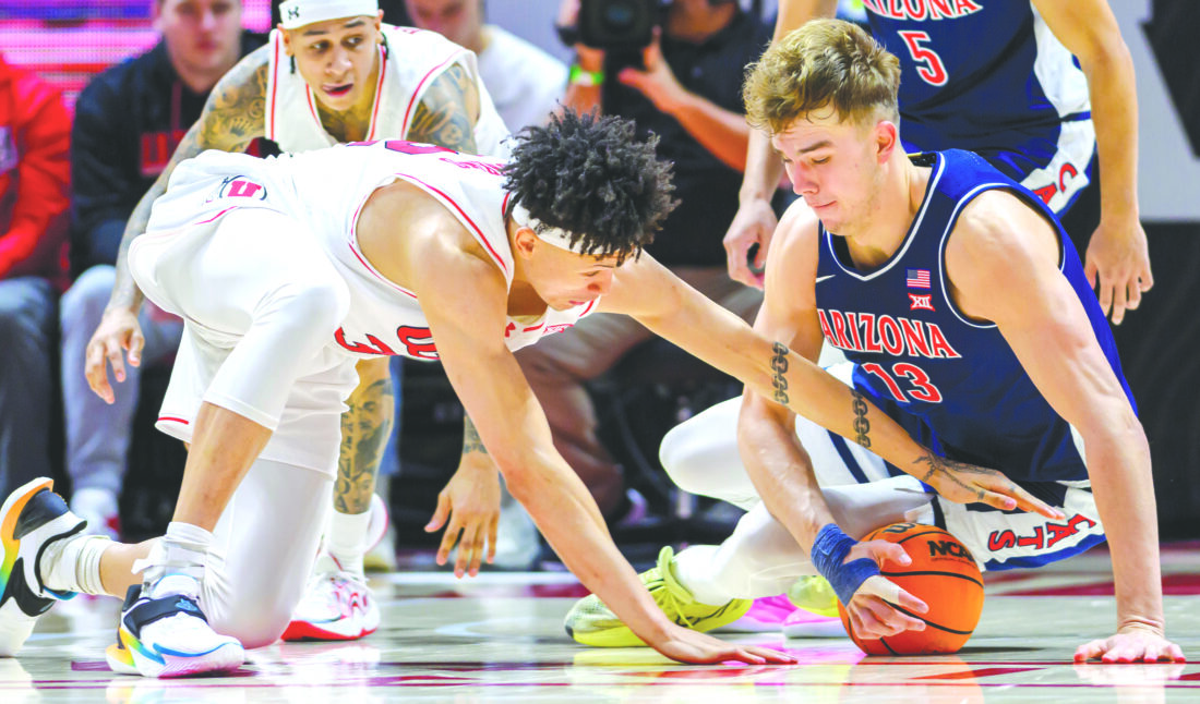Arizona center Motiejus Krivas, right, and Utah forward James Okonkwo battle for possession of a loose ball in the second half on Jan. 3 in Salt Lake City. (AP photo)