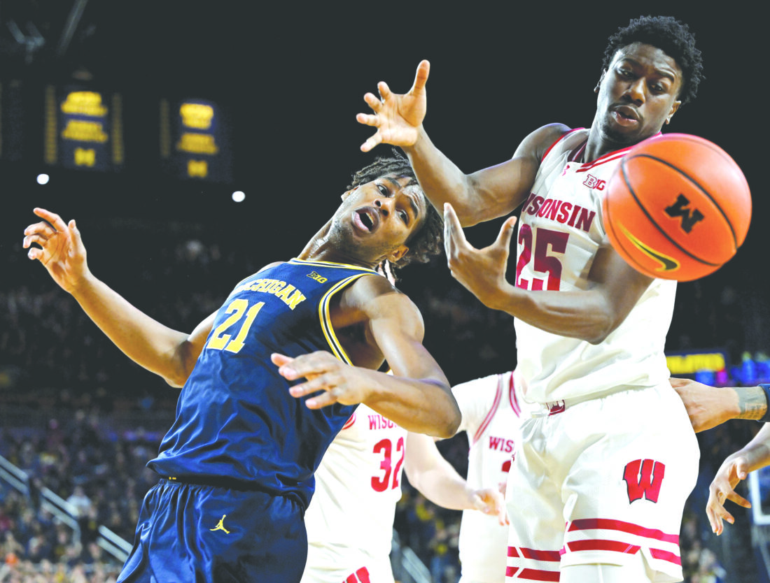 Michigan forward Morez Johnson Jr., left, battles for a loose ball with Wisconsin guard John Blackwell in the second half in Ann Arbor on Saturday. (AP photo)