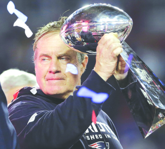 New England coach Bill Belichick holds up the Vince Lombardi Trophy as he celebrates the Patriots' victory over the Seattle Seahawks in Super Bowl XLIX on Feb. 1, 2015, in Glendale, Ariz. (AP file photo)