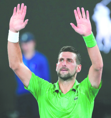 Novak Djokovic celebrates after defeating Jannik Sinner in their semifinal match at the Australian Open tennis championship in Melbourne, Australia, early today. (AP photo)