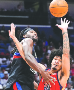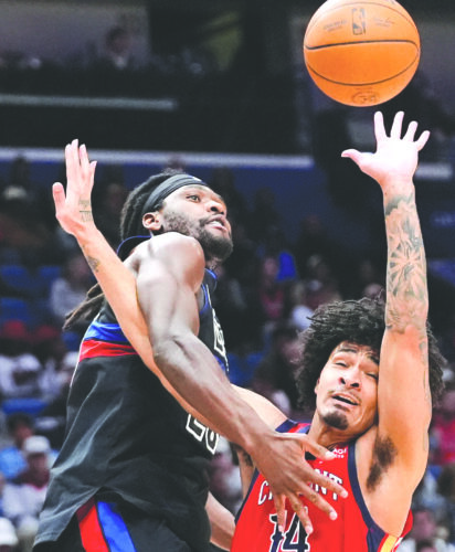 Pelicans guard Micah Peavy, right, battles for the ball against Detroit Pistons forward Isaiah Stewart in the second half on Wednesday in New Orleans. (AP photo)