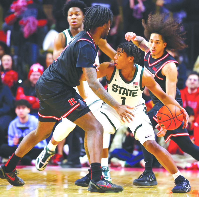 Michigan State guard Jeremy Fears Jr., center, dribbles the ball against Rutgers forward Bryce Dortch, left, and guard Lino Mark during the second half on Tuesday in Piscataway, N.J. (AP photo)