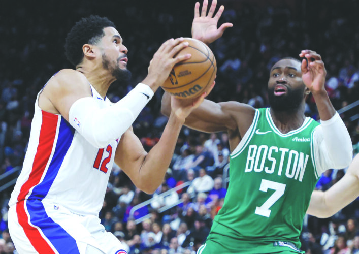 Pistons forward Tobias Harris, left, goes to the basket against Boston Celtics guard Jaylen Brown during the second half on Monday in Detroit. (AP photo)